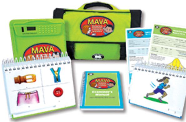 MAVA Examiner's Manual, Receptive Vocabulary Stimulus Easel, Expressive Vocabulary Stimulus Easel, Receptive Vocabulary Record Forms (30), and Expressive Vocabulary Record Forms (30), all in a black briefcase.